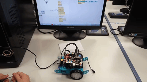 Para ello, hemos comenzado probando un programa que haga que nuestro robot se desplace hace adelante y gire, teniéndolo conectado al ordenador. Para cargarlo, hemos tenido que dejar que MakeBlock traduzca nuestro programa a código Arduino, para que el mBot sea capaz de almacenarlo y ejecutarlo.